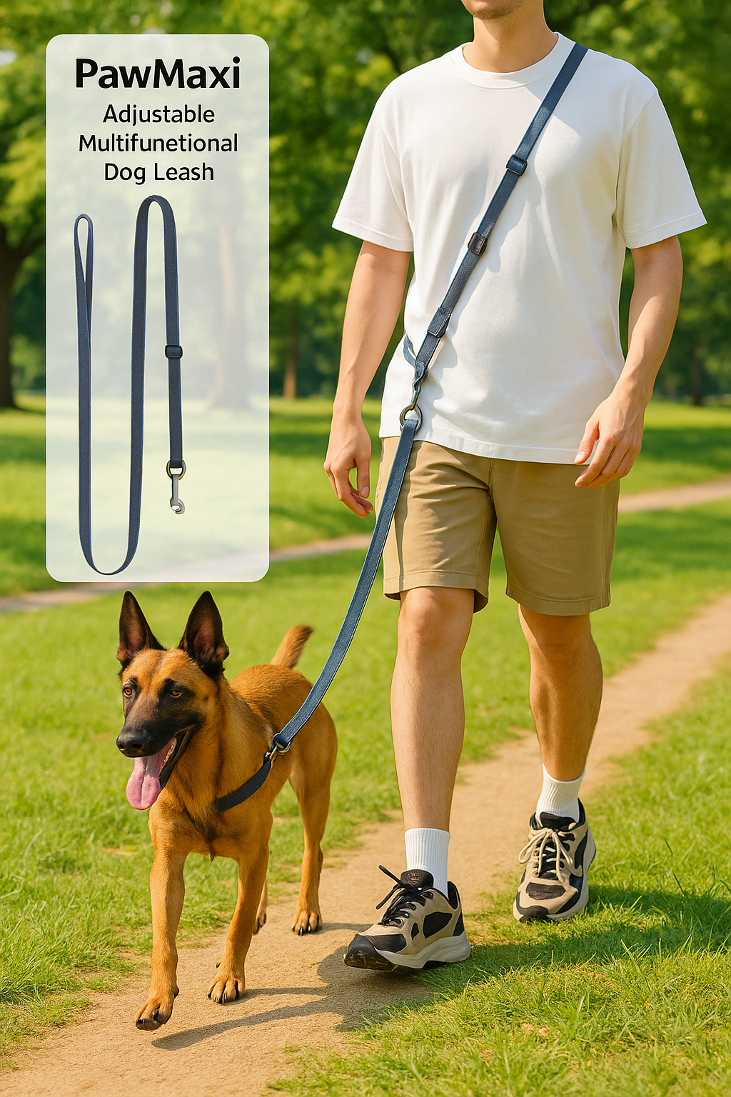 The leash adjusts from 206cm to 314cm, giving you flexible control depending on the situation
